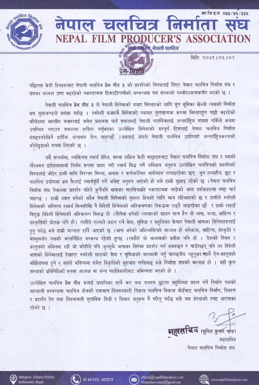 आइतबार विज्ञप्ती जारी गर्दै संघले हिन्दी भाषामा फिल्म देखाएर स्वदेशी सरह सेवा सुविधा मागदावी गर्नु उचित नभएको बताएको छ।