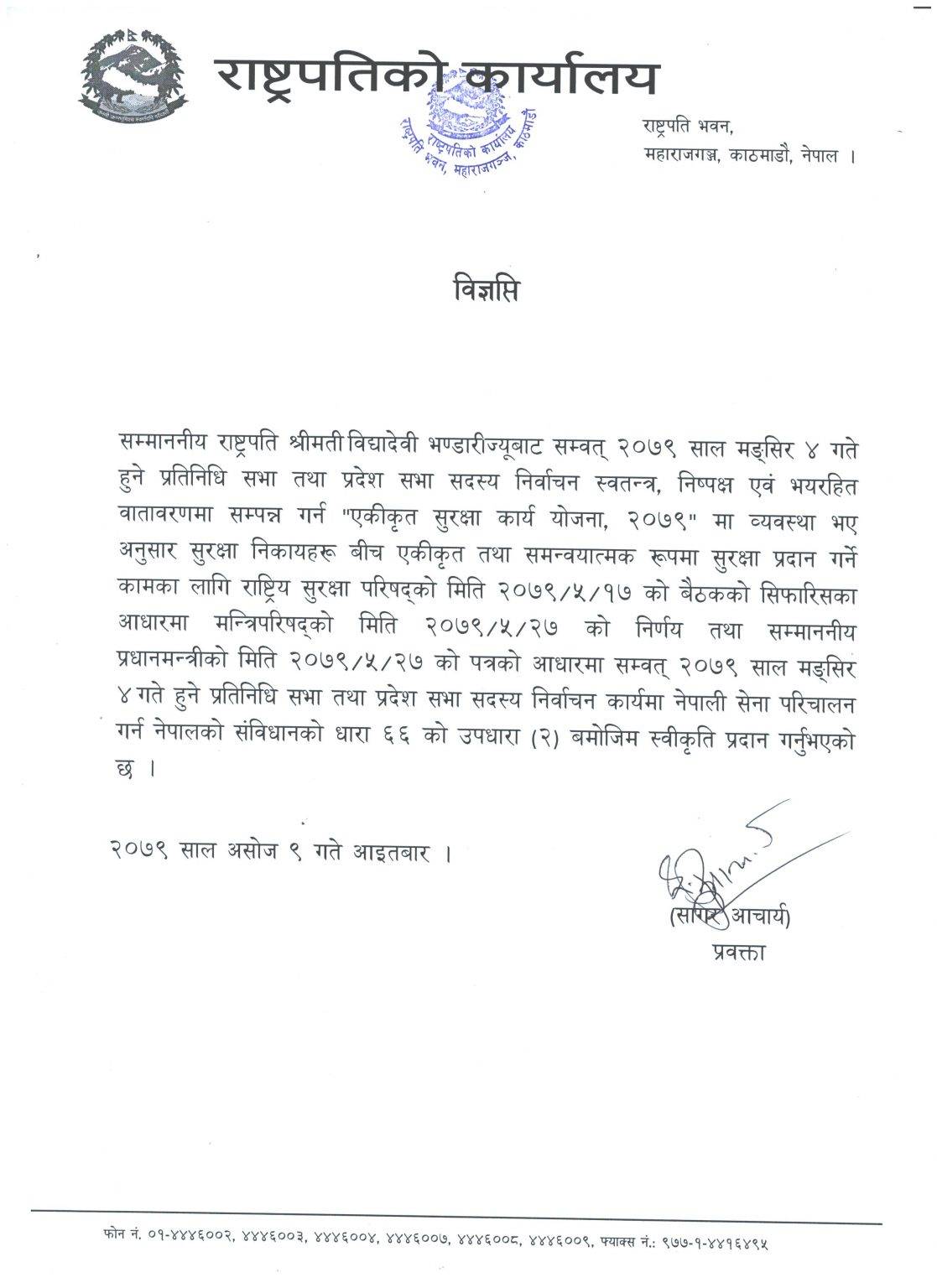 राष्ट्रपति विद्यादेवी भण्डारीले आगामी मंसिर ४ गते हुने प्रतिनिधि सभा र प्रदेश सभाको निर्वाचनमा सेनापरिचालन गर्न स्वीकृति दिएकी छन्।