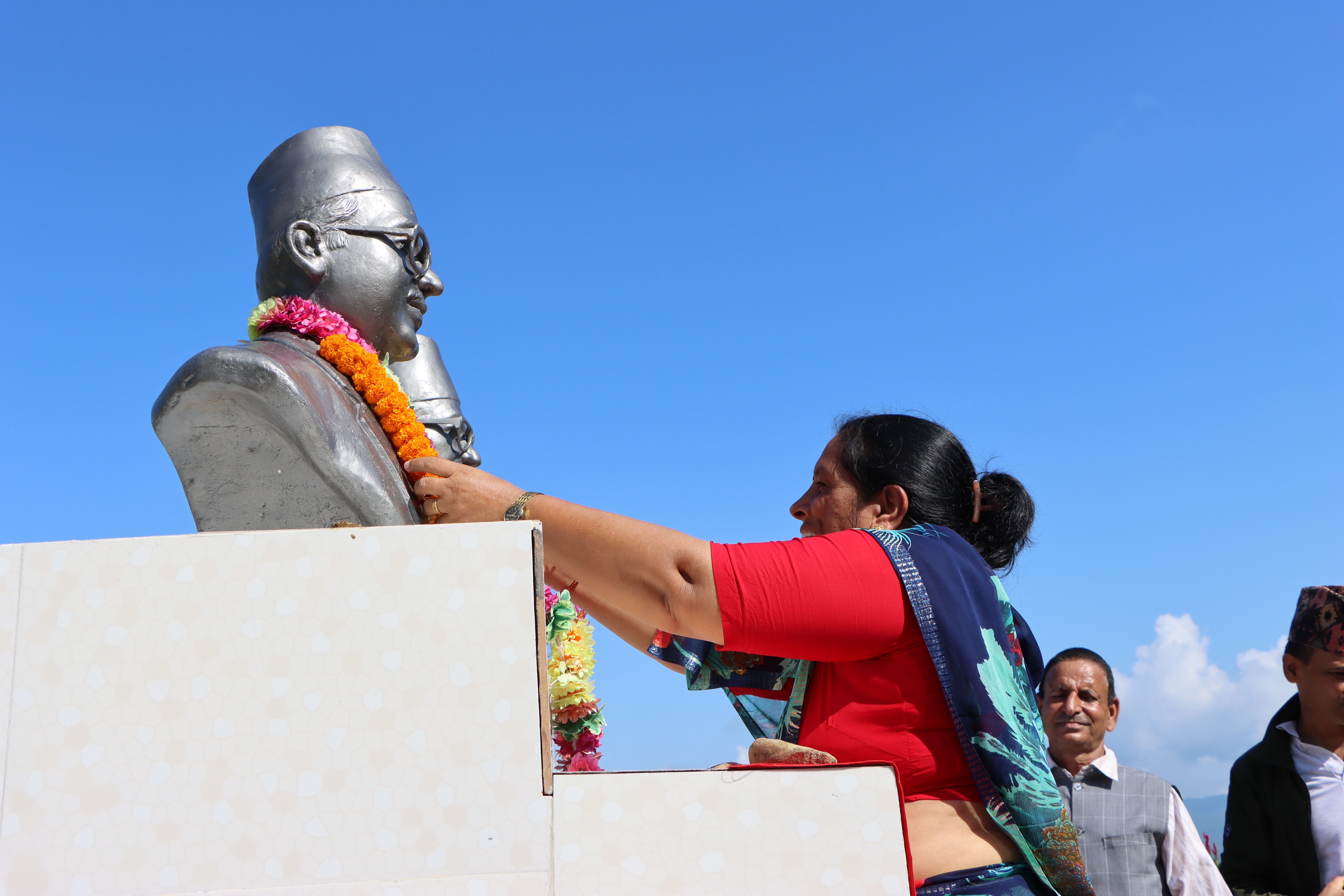 माल्यार्पण गर्दै विष्टले पुष्पलाल र मदन भण्डारीले देखाएकाे बाटाेमा आफू हिड्ने बताउनुभएको छ। देशलाई सुखि नेपाली र समृद्ध नेपाल अभियानमा नेतृत्वले दिएकाे जिम्मेवारी पूरा गर्ने र जनतालाई निराश नगर्ने बताउनुभएको छ। उहाँले “मंसीर ४ मा जनताले असल र विकासवादी नेतृत्व चुन्नेमा आफू विश्वस्त रहेको बताउनुभएको छ ।”
