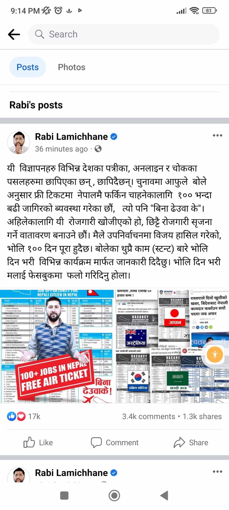 उनले लेखेका छन्, 'यी विज्ञापनहरू विभिन्न देशका पत्रीका, अनलाइन र चोकका पसलहरूमा छापिएका छन् , छापिँदै छन्। चुनावमा आफूले बोले अनुसार फ्री टिकटमा नेपालमै फर्किन चाहनेका लागि १०० भन्दा बढी जागिरको व्यवस्था गरेका छौँ, त्यो पनि 'बिना ढेउवा के'। अहिलेका लागि यी रोजगारी खोजिएको हो, छिट्टै रोजगारी सृजना गर्ने वातावरण बनाउने छौँ । मैले उपनिर्वाचनमा विजय हासिल गरेको, भोलि १०० दिन पूरा हुँदैछ। बोलेका थुप्रै काम (स्टन्ट) बारे भोलि दिनभरि विभिन्न कार्यक्रम मार्फत जानकारी दिँदैछु।'