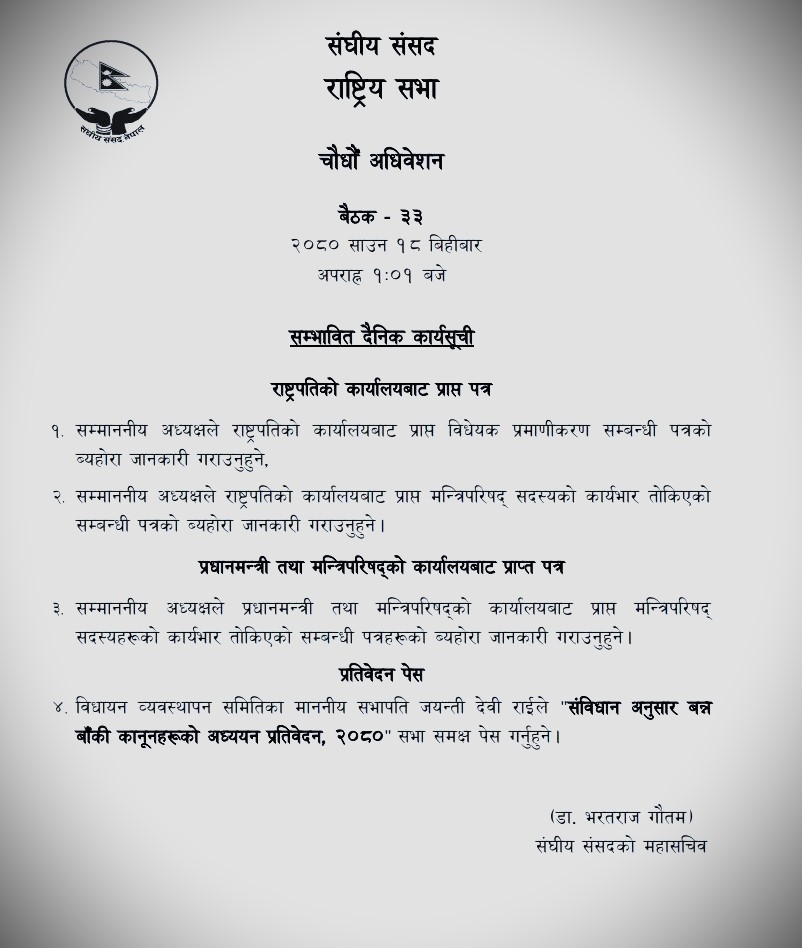 संसद् सचिवालयका अनुसार बैठकमा अध्यक्ष गणेश प्रसाद तिमिल्सिनाले राष्ट्रपतिको कार्यालयबाट प्राप्त विधेयक प्रमाणीकरण सम्बन्धी पत्र पढेर सुनाउने, राष्ट्रपतिको कार्यालयबाट प्राप्त मन्त्रिपरिषद् सदस्यको कार्यभार तोकिएको सम्बन्धी पत्रबारे जानकारी गराउने सम्भावित कार्यसूची रहेको छ ।